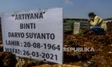Sejumlah keluarga dan kerabat jenazah pasien Covid-19 saat menaburkan bunga di TPU Rorotan, Jakarta, Ahad (28/3). (FOTO : Republika/Putra M. Akbar)