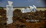 Petugas menggunakan baju hazmat saat memakamkan jenazah pasien Covid-19 di TPU Rorotan, Jakarta, Ahad (28/3). TPU Rorotan mulai difungsikan sebagai tempat pemakaman jenazah pasien Covid-19 dengan kapasitas sebanyak 1.500 petak makam pada tahap awal. (FOTO : Republika/Putra M. Akbar)