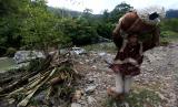 REPUBLIKA.CO.ID, ACEH BESAR -- Warga membawa barang yang masih dapat digunakan dari bangunan yang rusak akibat banjir bandang di lokasi wisata pemandian Humaira, Desa Pudeng, Aceh Besar, Aceh, Ahad (28/3).