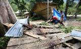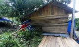 Warga membenahi bangunan kayu yang rusak akibat banjir bandang di lokasi wisata pemandian Humaira, Desa Pudeng, Aceh Besar, Aceh, Ahad (28/3). Banjir bandang yang terjadi pada 27 Maret 2021 mengkibatkan Sungai Pudeng meluap, puluhan bangunan dari kayu rusak berat dan seorang warga masih dalam pencarian karena terseret arus. (FOTO : ANTARA / Irwansyah Putra)