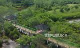 Foto udara pengunjung menikmati treking mangrove di Desa Apar, Kota Pariaman, Sumatera Barat, Ahad (28/3/2021). Badan Usaha Milik Desa (Bumdes) Apar dengan bantuan dari Kementerian Kelautan dan Perikanan membuka treking mangrove tersebut sebagai upaya menjaga dan melestarikan hutan mangrove dan mewujudkan destinasi wisata baru yang akan berdampak pada perekonomian masyarakat. (FOTO : ANTARA/Iggoy el Fitra)