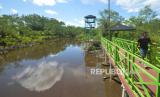 Pengunjung menikmati treking mangrove di Desa Apar, Kota Pariaman, Sumatera Barat, Ahad (28/3/2021). Badan Usaha Milik Desa (Bumdes) Apar dengan bantuan dari Kementerian Kelautan dan Perikanan membuka treking mangrove tersebut sebagai upaya menjaga dan melestarikan hutan mangrove dan mewujudkan destinasi wisata baru yang akan berdampak pada perekonomian masyarakat. (FOTO : ANTARA/Iggoy el Fitra)