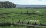 Pesepeda mengayuh sepedanya melintasi area persawahan di Kulon Progo, DI Yogyakarta, Ahad (28/3/2021). Sejumlah operator wisata di Yogyakarta menawarkan paket wisata bersepeda menyusuri suasana pedesaan dan area persawahan sebagai upaya membangkitkan pariwisata. (FOTO : ANTARAHendra Nurdiyansyah)