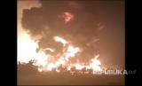 Foto tangkapan layar dari video yang beredar di grup Whatsapp menunjukkan api yang membumbung tinggi akibat kebakaran Kilang Pertamina RU VI Balongan terbakar di Indramayu, Senin (29/3) dini hari. (FOTO : Grup Whatsapp)