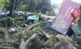 Pohon tumbang terjadi saat hujan deras, Ahad (28/3) sore, menyebabkan lima orang terluka, sejumlah motor rusak dan tujuh kios makan hancur. Selain hujan yang disertai angin, pohon tumbang disebabkan pohon sudah tua dan lapuk dibagian perakaran.
