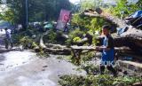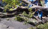 Petugas Gorong-gorong dan Kebersihan (Gober) menyingkirkan sisa dahan pohon Angsana dari jalan pada peristiwa pohon tumbang di Jalan Hasanudin, Kota Bandung, Senin (29/3). (FOTO : Edi Yusuf/Republika)