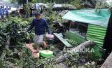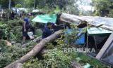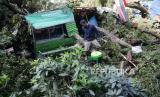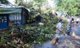 Pedagang mengambil barang-barang dari kiosnya yang hancur dalam peristiwa pohon tumbang di Jalan Hasanudin, Kota Bandung, Senin (29/3). Pohon tumbang terjadi saat hujan deras, Ahad (28/3) sore, menyebabkan lima orang terluka, sejumlah motor rusak dan tujuh kios makan hancur. Selain hujan yang disertai angin, pohon tumbang disebabkan pohon sudah tua dan lapuk dibagian perakaran. (FOTO : Edi Yusuf/Republika)