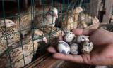 Seorang peternak Yalismawati, mengumpulkan telur hasil usaha ternak burung puyuhnya yang dimodali menggunakan Kredit Usaha Rakyat (KUR), di Lubuk Begalung, Padang, Sumatera Barat, Senin (29/3/2021). PT Asuransi Kredit Indonesia (Askrindo) memberikan penjaminan KUR sebanyak Rp20,69 triliun hingga Februari 2021 atau naik sekitar 20 persen dibanding periode yang sama tahun lalu, dengan total jumlah debitur mencapai 553.537 UMKM dan jumlah tenaga kerja yang diserap mencapai 827.649 orang. (FOTO : ANTARA/Iggoy el Fitra)