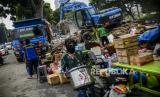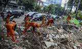 Petugas membersihkan puing-puing bangunan yang digusur di Jalan Soepomo, Tebet, Jakarta, Selasa (30/3). Bangunan kios yang berada di pinggir saluran Kali Baru itu digusur karena tidak memiliki sertifikat dan berdiri di lahan aset milik Pemerintah Provinsi DKI Jakarta. Republika/Putra M. Akbar (FOTO : Republika/Putra M. Akbar)