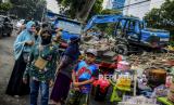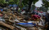 Warga mengambil puing-puing bangunan saat penggusuran di Jalan Soepomo, Tebet, Jakarta, Selasa (30/3). Bangunan kios yang berada di pinggir saluran Kali Baru itu digusur karena tidak memiliki sertifikat dan berdiri di lahan aset milik Pemerintah Provinsi DKI Jakarta. Republika/Putra M. Akbar (FOTO : Republika/Putra M. Akbar)