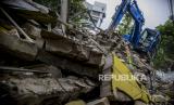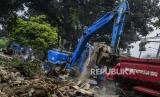 Petugas menggunakan alat berat saat membersihkan puing-puing bangunan yang digusur di Jalan Soepomo, Tebet, Jakarta, Selasa (30/3). Bangunan kios yang berada di pinggir saluran Kali Baru itu digusur karena tidak memiliki sertifikat dan berdiri di lahan aset milik Pemerintah Provinsi DKI Jakarta. Republika/Putra M. Akbar (FOTO : Republika/Putra M. Akbar)