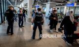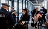 Petugas polisi federal Jerman memeriksa penumpang yang datang dari Palma de Mallorca untuk tes Covid-19 negatif saat mereka tiba di bandara di Frankfurt, Jerman, Selasa, Selasa (30/3). (FOTO : AP / Michael Probst)
