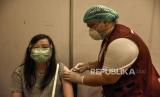 Vaksinator menyuntikan vaksin Covid-19 ke pekerja mal di Hotel Aryaduta, Jalan Sumatera, Kota Bandung, Rabu (31/3). Menteri Kesehatan Budi Gunadi Sadikin mengungkapkan perkembangan program vaksinasi nasional saat ini telah mencapai angka 10 juta dosis vaksin. Indonesia berhasil menjadi salah satu dari empat negara terbanyak dalam memberikan vaksin di luar negara produksi vaksin. (FOTO : REPUBLIKA/ABDAN SYAKURA)