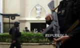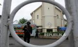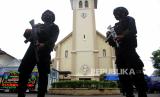 REPUBLIKA.CO.ID, MAKASSAR -- Anggota Brimob Polda Sulsel berjaga di depan Gereja Katedral Makassar, Sulawesi Selatan, Rabu (31/3). Jelang perayaan hari Paskah 2021 akhir pekan nanti, penjagaan di gereja tersebut diperketat pascaledakan bom bunuh diri pada Ahad (28/3).