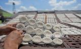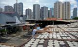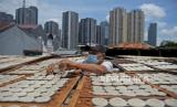 REPUBLIKA.CO.ID, JAKARTA -- Pengusaha kerupuk H Cece Rahman (63) menjemur kerupuk mentah sebelum digoreng di UMKM Kerupuk Melati, Jakarta, Rabu (31/3). PT Asuransi Kredit Indonesia (Askrindo) terus menjalankan tugas dalam menjamin kredit khususnya bagi usaha kecil atau Kredit Usaha Rakyat (KUR). Hal itu dilakukan sebagai bentuk dukungan percepatan pemulihan ekonomi nasional melalui pemberdayaan dengan menjaga kelangsungan hidup pelaku Usaha Mikro Kecil dan Menengah (UMKM).
