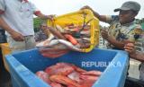 Nelayan memindahkan ikan kakap kualitas ekspor di Batang Arau, Padang, Sumatera Barat, Rabu (31/3/2021). Stasiun Karantina Ikan, Pengendalian Mutu, dan Keamanan Hasil Perikanan (SKIPM) Padang mencatat, kini ekspor ikan kakap tidak dilakukan secara langsung namun melalui jalur domestik yakni dari Jakarta dan Dumai,. (FOTO : ANTARA/Iggoy el Fitra)