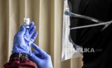 Vaksinator bersiap menyuntikan vaksin Covid-19 Astrazeneca ke PNS di Perawatan Umum Lanud Husein Sastranegara, Kota Bandung, Kamis (1/4). Kegiatan vaksinasi Covid-19 yang diikuti oleh sedikitnya 350 anggota TNI dan PNS tersebut digelar dalam rangka kegiatan Serbuan 130.000 Vaksin Astrazeneca tahap 1 bagi anggota TNI dan PNS di wilayah Kota Bandung. Foto: Republika/Abdan Syakura (FOTO : REPUBLIKA/ABDAN SYAKURA)