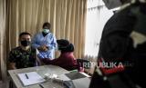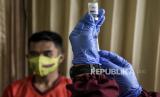 Vaksinator bersiap menyuntikan vaksin Covid-19 Astrazeneca ke anggota TNI di Perawatan Umum Lanud Husein Sastranegara, Kota Bandung, Kamis (1/4). Kegiatan vaksinasi Covid-19 yang diikuti oleh sedikitnya 350 anggota TNI dan PNS tersebut digelar dalam rangka kegiatan Serbuan 130.000 Vaksin Astrazeneca tahap 1 bagi anggota TNI dan PNS di wilayah Kota Bandung. Foto: Republika/Abdan Syakura (FOTO : REPUBLIKA/ABDAN SYAKURA)