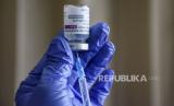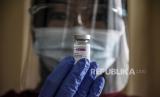 Vaksinator menunjukkan botol kemasan vaksin Covid-19 Astrazeneca di Perawatan Umum Lanud Husein Sastranegara, Kota Bandung, Kamis (1/4). Kegiatan vaksinasi Covid-19 yang diikuti oleh sedikitnya 350 anggota TNI dan PNS tersebut digelar dalam rangka kegiatan Serbuan 130.000 Vaksin Astrazeneca tahap 1 bagi anggota TNI dan PNS di wilayah Kota Bandung. Foto: Republika/Abdan Syakura (FOTO : REPUBLIKA/ABDAN SYAKURA)