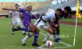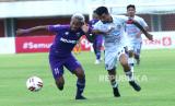Penyerang Bali United Spasojevic dibayangi bek Persita saat pertandingan lanjutan Piala Menpora 2021 di Stadion Maguwoharjo, Sleman, Yogyakarta, Jumat (2/4). Pada pertandingan ini berakhir imbang 1-1. Dan Bali United memastikan lolos ke fase berikutnya. (FOTO : Wihdan Hidayat / Republika)