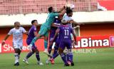 Kiper Persita Tri Hamdani menepis bola saat melawan Bali United pada pertandingan lanjutan Piala Menpora 2021 di Stadion Maguwoharjo, Sleman, Yogyakarta, Jumat (2/4). Pada pertandingan ini berakhir imbang 1-1. Dan Bali United memastikan lolos ke fase berikutnya. (FOTO : Wihdan Hidayat / Republika)