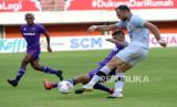 Penyerang Bali United Spasojevic mencoba melepaskan dari bek Persita Kevin saat pertandingan lanjutan Piala Menpora 2021 di Stadion Maguwoharjo, Sleman, Yogyakarta, Jumat (2/4). Pada pertandingan ini berakhir imbang 1-1. Dan Bali United memastikan lolos ke fase berikutnya. (FOTO : Wihdan Hidayat / Republika)