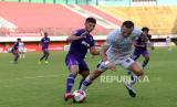 Kapten Bali United S Lilipaly berebut bola dengan bek Persita M Toha saat pertandingan lanjutan Piala Menpora 2021 di Stadion Maguwoharjo, Sleman, Yogyakarta, Jumat (2/4). Pada pertandingan ini berakhir imbang 1-1. Dan Bali United memastikan lolos ke fase berikutnya. (FOTO : Wihdan Hidayat / Republika)