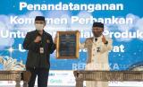 Kepala Perwakilan BI Jawa Barat Herawanto (kanan) dan Direktur Pengawasan Lembaga Jasa Keuangan 2 dan Manajemen Strategis Kantor Regional 2 Jawa Barat Aulia Fadly (kiri) menunjukan piagam komitmen Perbankan dalam mendukung produk UMKM saat kampanye Gerakan Indonesia Bersama UMKM dan ajang Gernas Bangga Buatan Indonesia di Bandung, Jawa Barat, Sabtu (3/4/2021). Kampanye Gernas Bangga Buatan Indonesia (BBI) yang berlangsung pada bulan April 2021 di Jawa Barat ini mengangkat tema UKM Jabar Paten. (FOTO : Antara/M Agung Rajasa)