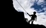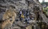 Wisatawan melakukan pemanjatan di kawasan wisata Curug Batu Templek, Cisanggarung Lebak, Kabupaten Bandung, Ahad (4/4). Kawasan wisata tersebut selain memiliki lanskap alam air terjun atau curug yang terbentuk akibat pelapukan batu selama jutaan tahun, juga menawarkan olahraga panjat tebing bagi pegiat olahraga ekstrem. Foto: Republika/Abdan Syakura (FOTO : REPUBLIKA/ABDAN SYAKURA)