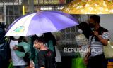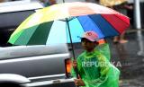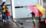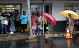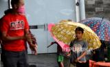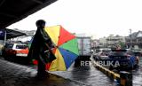 Ojek payung menunggu pelanggan saat hujan deras di Stasiun Yogyakarta, Ahad (4/4). Hujan lebat menjadi ladang rezeki bagi warga sekitar stasiun. Mereka menawarkan jasa ojek payung kepada warga di stasiun. Upah yang didapat cukup lumayan meski tarif yang diberikan seikhlasnya. (FOTO : Wihdan Hidayat / Republika)
