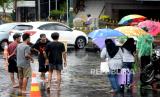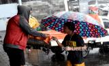 Ojek payung mengawal pelanggan saat hujan deras di Stasiun Yogyakarta, Ahad (4/4). Hujan lebat menjadi ladang rezeki bagi warga sekitar stasiun. Mereka menawarkan jasa ojek payung kepada warga di stasiun. Upah yang didapat cukup lumayan meski tarif yang diberikan seikhlasnya. (FOTO : Wihdan Hidayat / Republika)