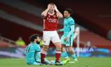 Reaksi Kieran Tierney saat pertandingan sepak bola Liga Utama Inggris antara Arsenal FC dan Liverpool FC di London, Inggris, 3 April 2021. (FOTO : Julian Finney / POOL/GETTY POOL)