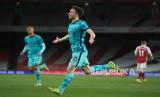 Diogo Jota merayakan setelah mencetak keunggulan 0-1 selama pertandingan sepak bola Liga Premier Inggris antara Arsenal FC dan Liverpool FC di London, Inggris, 3 April 2021. (FOTO : Adam Davy / POOL/PA POOL)