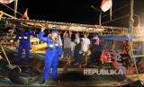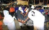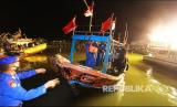 REPUBLIKA.CO.ID,INDRAMAYU -- Petugas SAR gabungan membawa korban Anak Buah Kapal (ABK) KM Barokah Jaya yang tenggelam saat evakuasi di pelabuhan ikan Eretan wetan, Kandanghaur, Indramayu, Jawa Barat, Ahad (4/4/2021) malam.