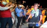 Sejumlah ABK KM Barokah Jaya yang selamat tiba di pelabuhan ikan Eretan wetan, Kandanghaur, Indramayu, Jawa Barat, Minggu (4/4/2021) malam. (FOTO : Antara/Dedhez Anggara)