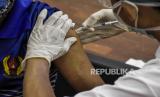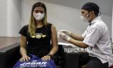 Vaksinator menyuntikan vaksin Covid-19 ke atlet di Sport Jabar Arcamanik, Jalan Pacuan Kuda, Kota Bandung, Senin (5/4). Sedikitnya 800 atlet dan ofisial Jawa Barat yang akan berlaga dalam Pekan Olahraga Nasional (PON) XX Papua menerima suntikan vaksin Covid-19 dosis pertama. Foto: Republika/Abdan Syakura (FOTO : REPUBLIKA/ABDAN SYAKURA)
