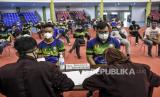 Sejumlah atlet dan ofisial dari berbagai cabang olahraga menjalani tahap pemeriksaan kesehatan sebelum disuntik vaksin Covid-19 di Sport Jabar Arcamanik, Jalan Pacuan Kuda, Kota Bandung, Senin (5/4). Sedikitnya 800 atlet dan ofisial Jawa Barat yang akan berlaga dalam Pekan Olahraga Nasional (PON) XX Papua menerima suntikan vaksin Covid-19 dosis pertama. Foto: Republika/Abdan Syakura (FOTO : REPUBLIKA/ABDAN SYAKURA)