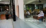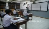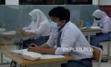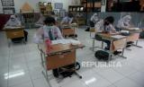 Sejumlah siswa dengan menjaga jarak dan menggunakan meja bersekat mengikuti persiapan Kompetisi Sains Nasional di SMAN 81 Jakarta, Senin (5/4). Pemerintah Provinsi (Pemprov) DKI akan melakukan uji coba pembelajaran tatap muka di 100 sekolah mulai 7 April hingga 29 April 2021 dengan menerapkan protokol kesehatan COVID-19. Skema yang diterapkan adalah para siswa belajar tatap muka secara bergantian. (FOTO : Prayogi/Republika.)