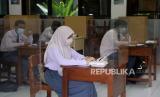 Sejumlah siswa dengan menjaga jarak dan menggunakan meja bersekat mengikuti persiapan Kompetisi Sains Nasional di SMAN 81 Jakarta, Senin (5/4). Pemerintah Provinsi (Pemprov) DKI akan melakukan uji coba pembelajaran tatap muka di 100 sekolah mulai 7 April hingga 29 April 2021 dengan menerapkan protokol kesehatan COVID-19. Skema yang diterapkan adalah para siswa belajar tatap muka secara bergantian. Prayogi/Republika (FOTO : Prayogi/Republika.)