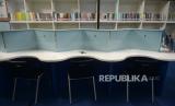 Tanda jaga jarak terpasang diperpustakaan SMAN 81 Jakarta, Senin (5/4). Pemerintah Provinsi (Pemprov) DKI akan melakukan uji coba pembelajaran tatap muka di 100 sekolah mulai 7 April hingga 29 April 2021 dengan menerapkan protokol kesehatan COVID-19. Skema yang diterapkan adalah para siswa belajar tatap muka secara bergantian. Prayogi/Republika (FOTO : Prayogi/Republika.)