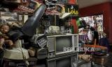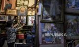 Pedagang beraktivitas di kiosnya di Pasar Antik Cikapundung, Braga, Kota Bandung, Senin (5/4). Pedagang di pasar barang kuno dan antik tersebut terus bertahan dan berusaha bangkit meski penjualan masih mengalami penurunan hingga 60 persen terdampak pandemi Covid-19 yang mengakibatkan penurunan jumlah pembeli. (FOTO : REPUBLIKA/ABDAN SYAKURA)