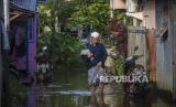 Seorang warga melintasi banjir akibat luapan Sungai Martapura di Kelayan A, Banjarmasin, Kalimantan Selatan, Senin (5/4/2021). Hujan deras yang mengguyur sejumlah wilayah di Provinsi Kalimantan Selatan beberapa hari belakangan ini membuat kanal dan Sungai Martapura di Kota Banjarmasin meluap sehingga mengakibatkan sejumlah rumah dan jalan terendam banjir. (FOTO : BAYU PRATAMA S/ANTARA )