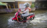 Pengendara motor melintasi banjir akibat luapan Sungai Martapura di Kelayan A, Banjarmasin, Kalimantan Selatan, Senin (5/4/2021). Hujan deras yang mengguyur sejumlah wilayah di Provinsi Kalimantan Selatan beberapa hari belakangan ini membuat kanal dan Sungai Martapura di Kota Banjarmasin meluap sehingga mengakibatkan sejumlah rumah dan jalan terendam banjir. (FOTO : BAYU PRATAMA S/ANTARA )