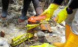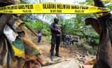 Petugas Inafis Polda Jambi melakukan olah tempat kejadian perkara (TKP) di sumur minyak yang dipasangi garis polisi saat operasi penertiban di Taman Hutan Raya Sultan Thaha Syaifuddin, Batanghari, Jambi, Senin (5/4/2021). Puluhan personel gabungan dari Polda Jambi, Polres Batanghari dan instansi terkait menutup puluhan sumur minyak ilegal melalui operasi Illegal Drilling Siginjai 2021 guna menghentikan aktivitas pertambangan liar yang masih marak ditemukan dalam beberapa tahun terakhir di daerah itu. (FOTO : ANTARA/Wahdi Septiawan)