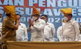 Wakil Ketua Umum Kamar Dagang dan Industri (KADIN) Indonesia Bidang Organisasi, Keanggotaan dan Pemberdayaan Daerah Anindya Bakrie (tengah) dan Ketua Umum KADIN Sulawesi Tengah Muh. Nur Rahmatu (kanan) memberi salam kepada Gubernur Sulawesi Tengah Longki Djanggola (kiri) usai pelantikan pengurus KADIN Sulawesi Tengah di Palu, Sulawesi Tengah, Selasa (6/4/2021). KADIN Indonesia secara maraton melantik pengurus di sejumlah provinsi di Indonesia untuk periode 2021-2026. (FOTO : BASRI MARZUKI/ANTARAFOTO)