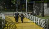 Seorang anak bersama orang tuanya saat bermain di Taman Puring, Jakarta, Selasa (6/4). Taman Puring kembali dibuka di tengah masa Pemberlakuan Pembatasan Kegiatan Masyarakat (PPKM) Mikro, sebanyak tiga hutan kota dan 25 taman kota di DKI Jakarta telah dibuka kembali untuk umum. (FOTO : Republika/Putra M. Akbar)