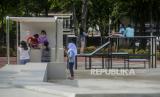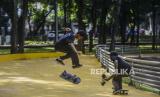 Anak-anak bermain skateboard di Taman Puring, Jakarta, Selasa (6/4). Taman Puring kembali dibuka di tengah masa Pemberlakuan Pembatasan Kegiatan Masyarakat (PPKM) Mikro, sebanyak tiga hutan kota dan 25 taman kota di DKI Jakarta telah dibuka kembali untuk umum. (FOTO : Republika/Putra M. Akbar)