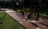 Anak-anak saat bermain di Taman Puring, Jakarta, Selasa (6/4). Taman Puring kembali dibuka di tengah masa Pemberlakuan Pembatasan Kegiatan Masyarakat (PPKM) Mikro, sebanyak tiga hutan kota dan 25 taman kota di DKI Jakarta telah dibuka kembali untuk umum. (FOTO : Republika/Putra M. Akbar)