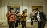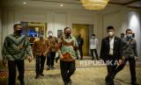 Menteri BUMN Erick Thohir menyalami tamu undangan saat menghadiri acara Tokoh Perubahan Republika 2020 di Jakarta, Senin (5/4). Republika memberikan penghargaan kepada lima tokoh dalam gelaran malam Anugerah Tokoh Perubahan 2020 dengan tema Hikmah Kebersamaan Untuk Bangkit dari Pandemi. Republika/Putra M. Akbar (FOTO : Republika/Putra M. Akbar)