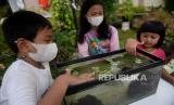 Sejumlah anak memberi makan ikan di ruang edukasi anak di halaman Kantor Kelurahan Karet, Jakarta, Rabu (7/4). Ruang terbuka yang berkonsep kebun binatang mini (mini zoo) ini memiliki sejumlah koleksi hewan peliharaan seperti kelinci, burung dan ikan hias. Adanya mini zoo tersebut berfungsi sebagai ruang interaksi serta sarana edukasi bagi warga. (FOTO : Prayogi/Republika.)